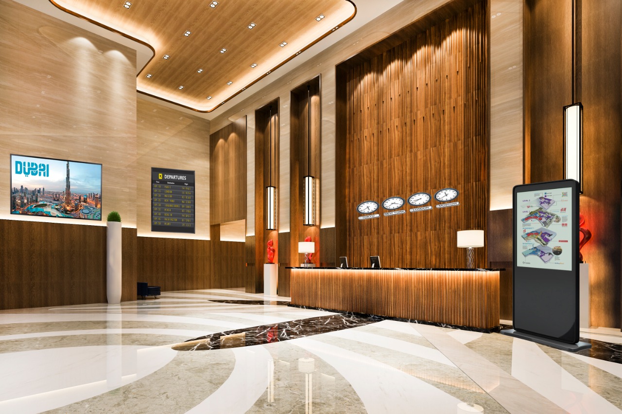 In the realm of Digital Signage & Wayfinding Solutions, integrated approaches with Property Management Systems (PMS), Meeting Room and Elevator Signage, Workspace Management solutions, as well as IoT Integration solutions (BMS, FAS, Parking Management) and Flight Information Signage, showcase the versatility and effectiveness of digital signage displays within the hospitality sector.